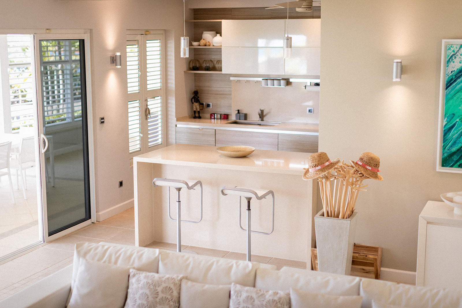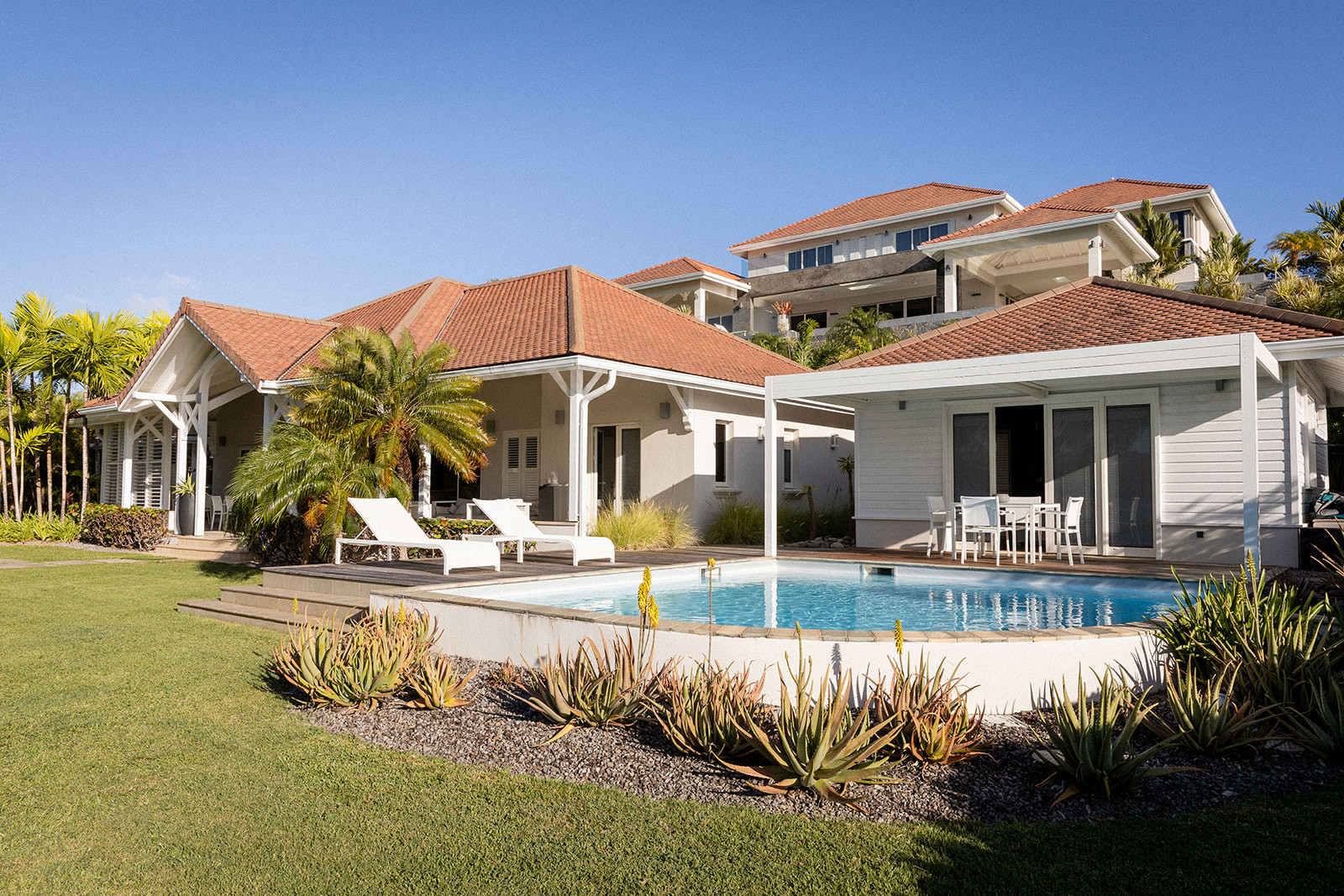 This modern Creole-style villa features a fully equipped kitchen opening onto a comfortable living room that extends onto a large terrace. On the ground floor, there are two suites and a bungalow overlooking the pool.