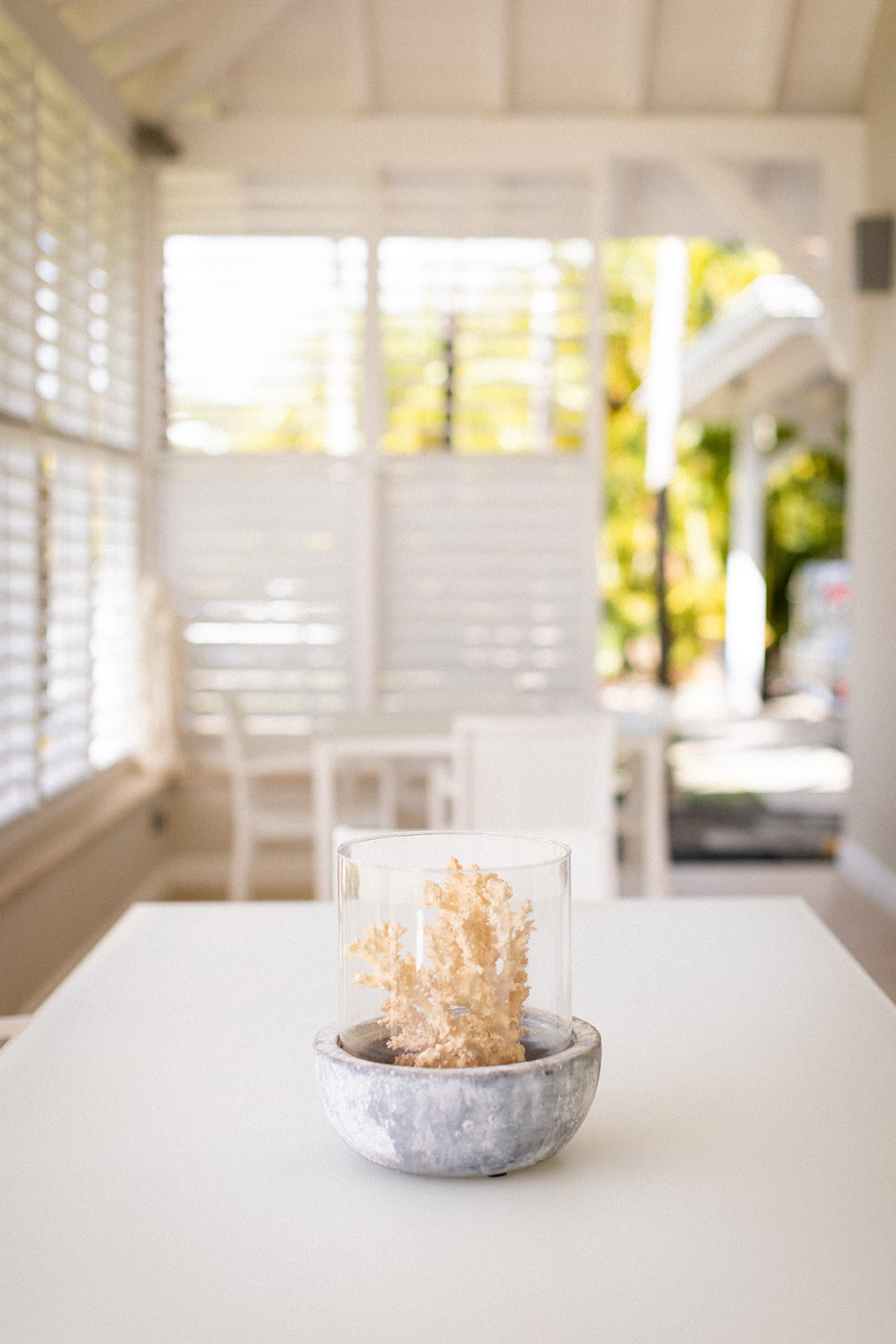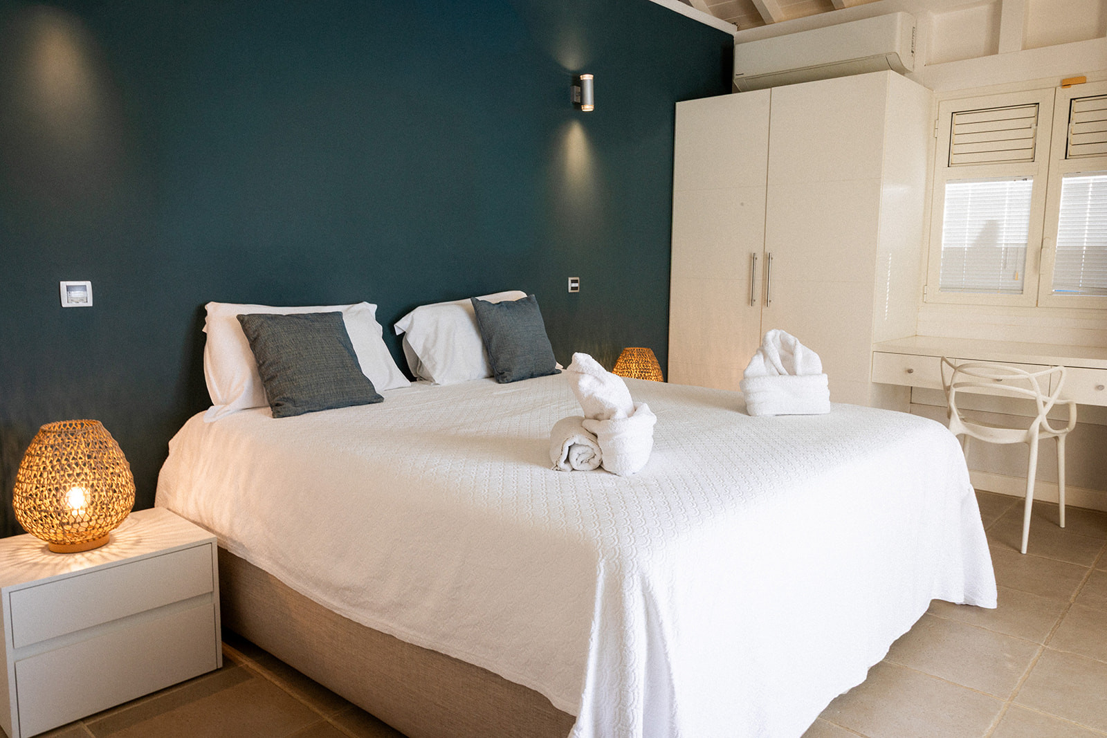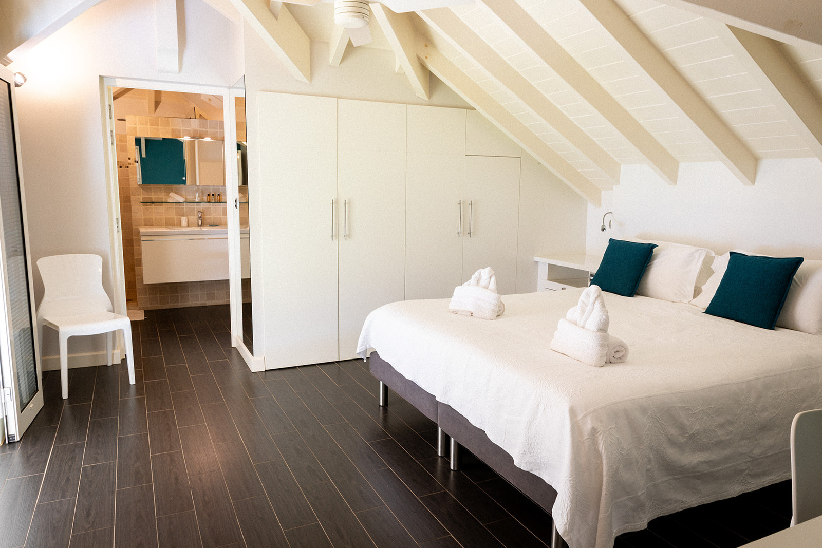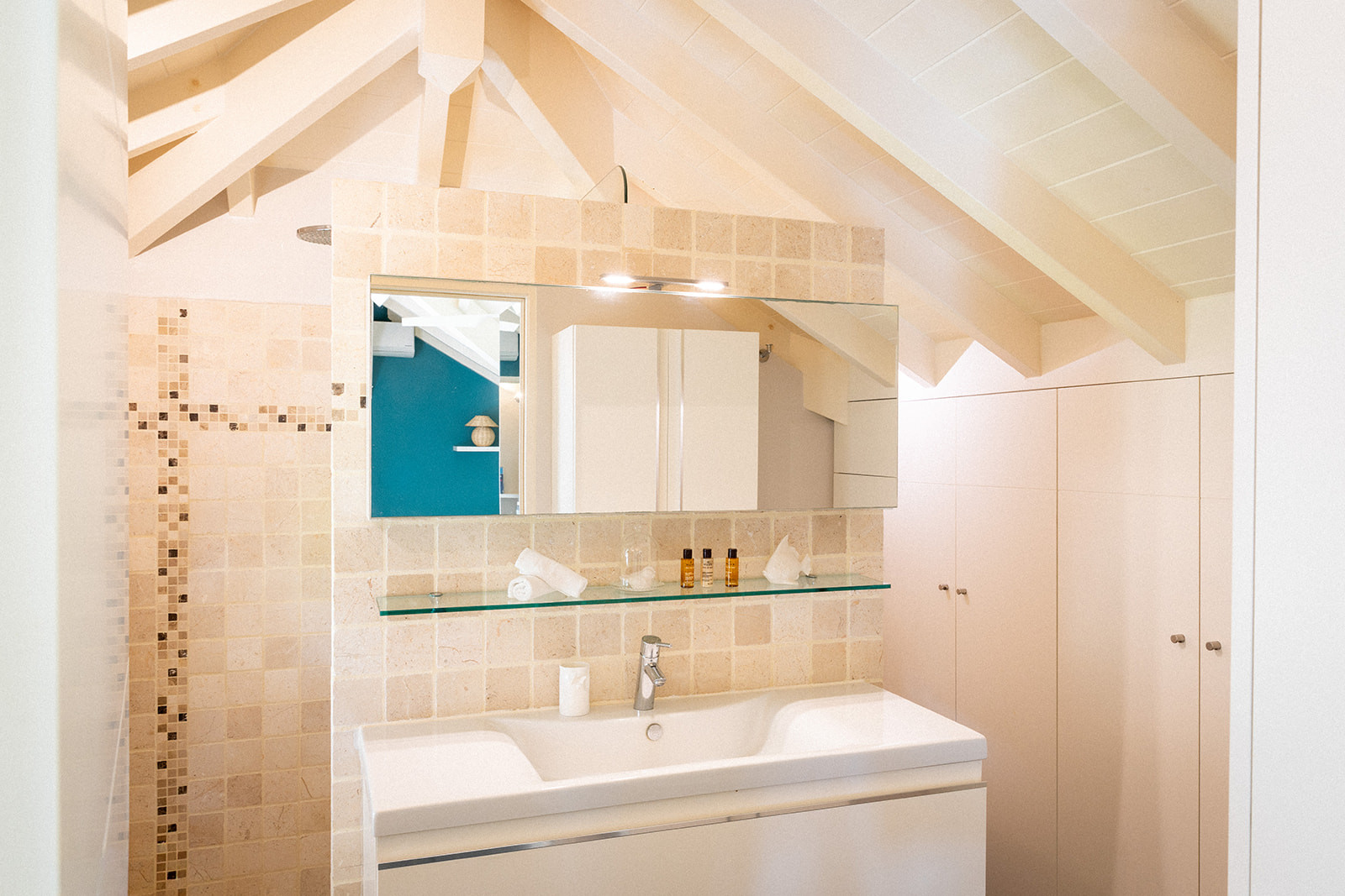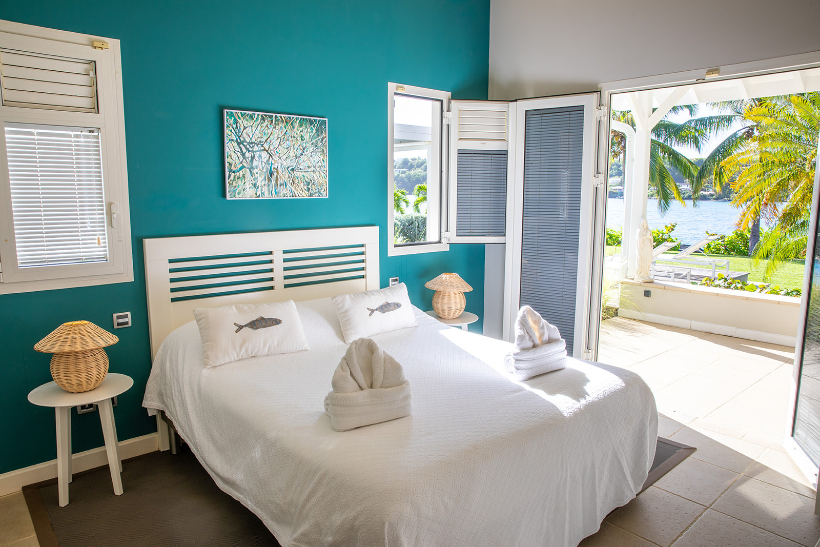 Upstairs, a suite overlooks the terrace and the sea.