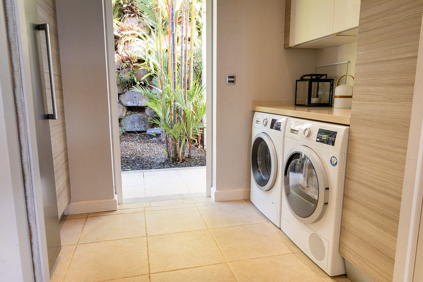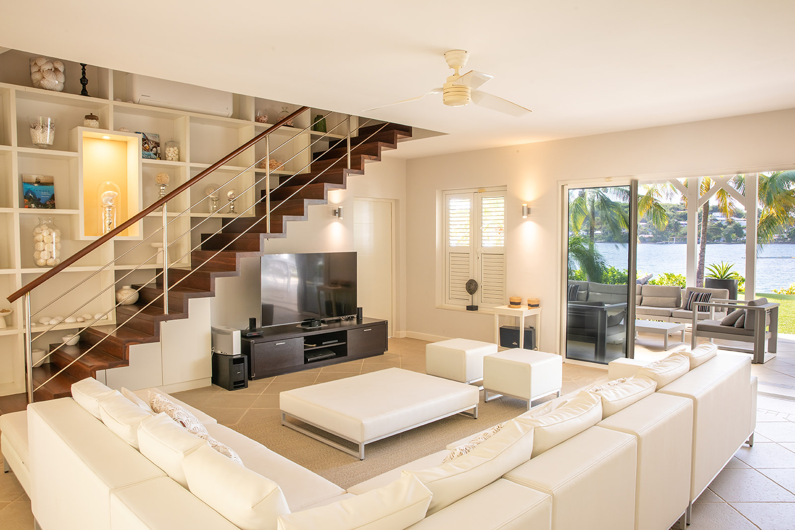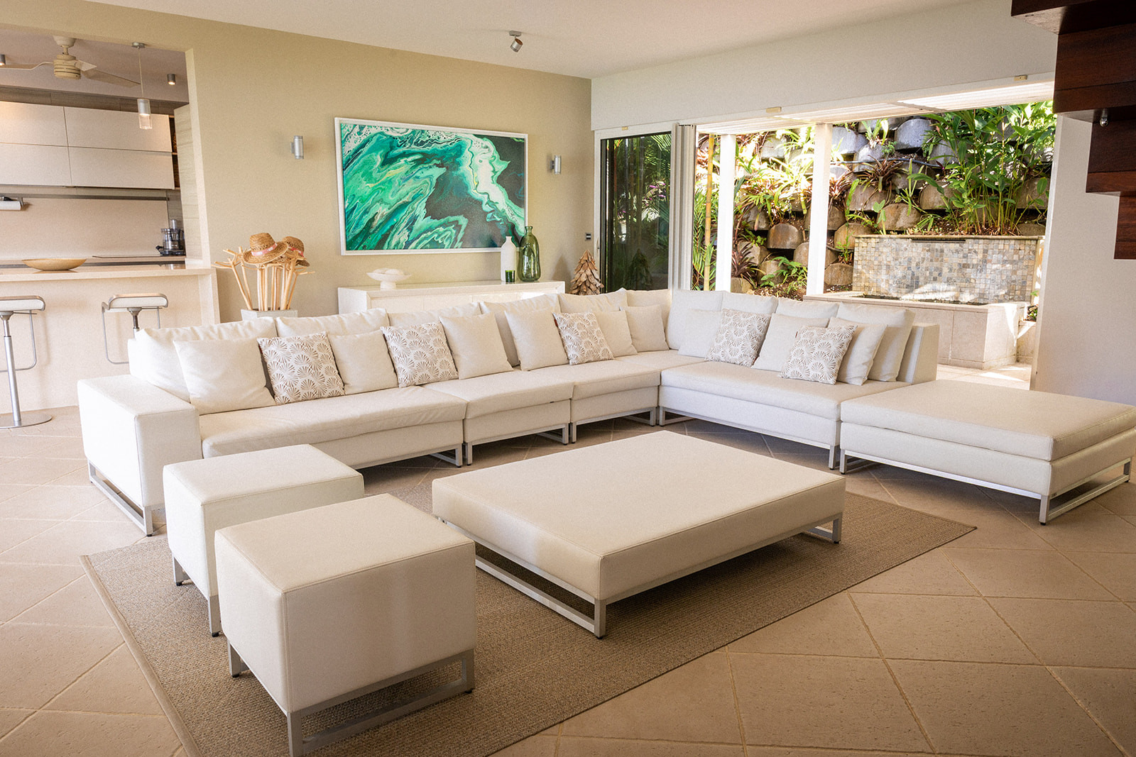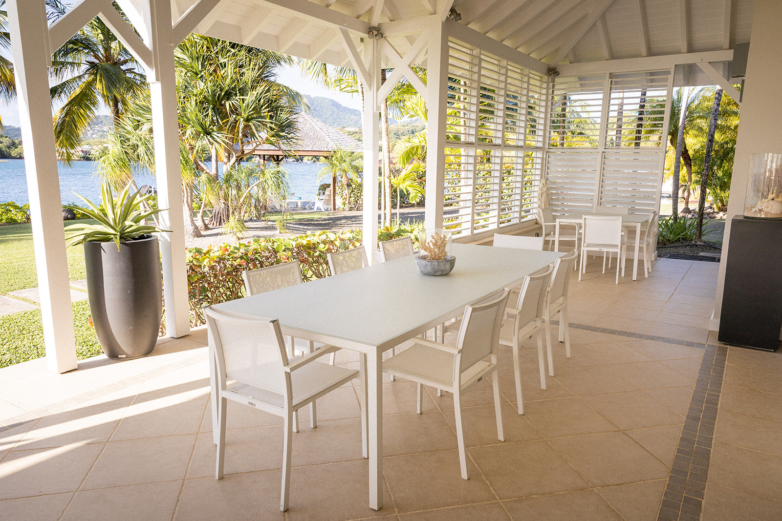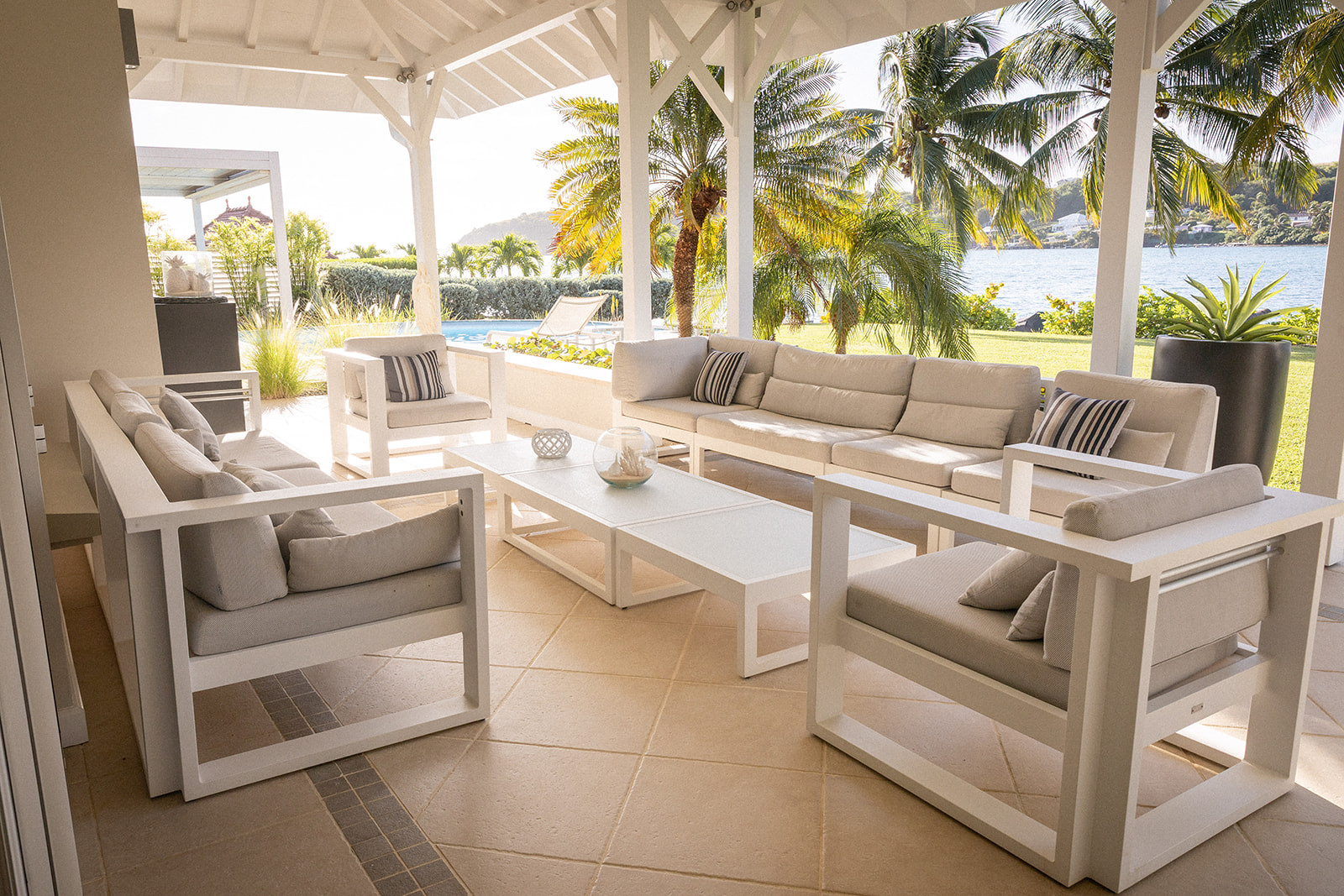 With its stunning beachfront location, the villa enjoys a peaceful and verdant setting. Situated right on the water, the villa boasts a private dock.